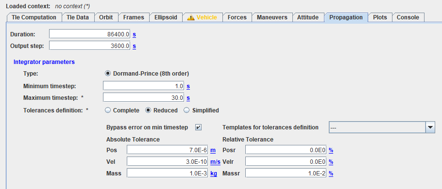 In this panel, the user may define the duration of the propagation as well as the output step in the ephemeris. The spacecraft states inside this ephemeris will be expressed in the GCRF frame.